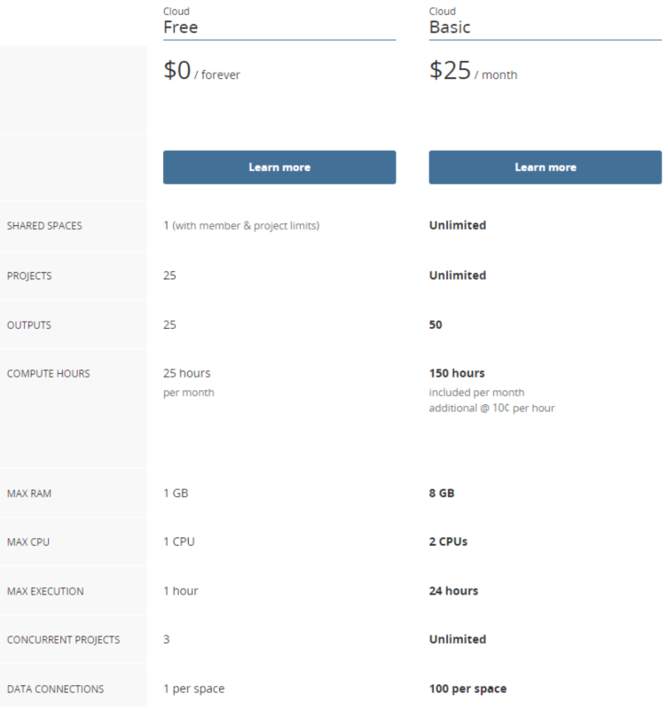 As the screenshot above shows, there are limitations on the free-of-charge tier of RStudio in posit Cloud. Specifically, the limitation of 1GB of RAM will prevent some R packages from operating. The Basic paid plan provides significantly more RAM and computing power, but at a cost of $25 USD/month.